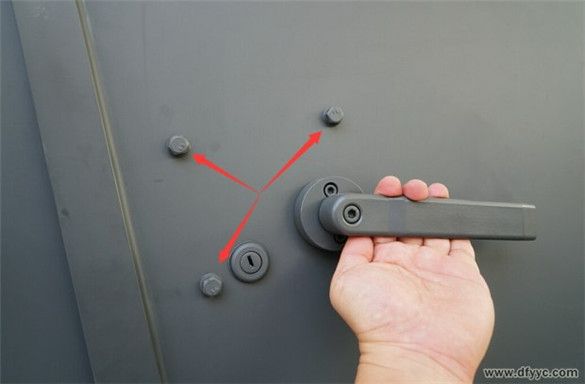 外拉手由上向下旋轉(zhuǎn)開啟,并采用一字鎖鑰匙鎖閉。紅色箭頭所指的是固定車門鎖具的螺栓。