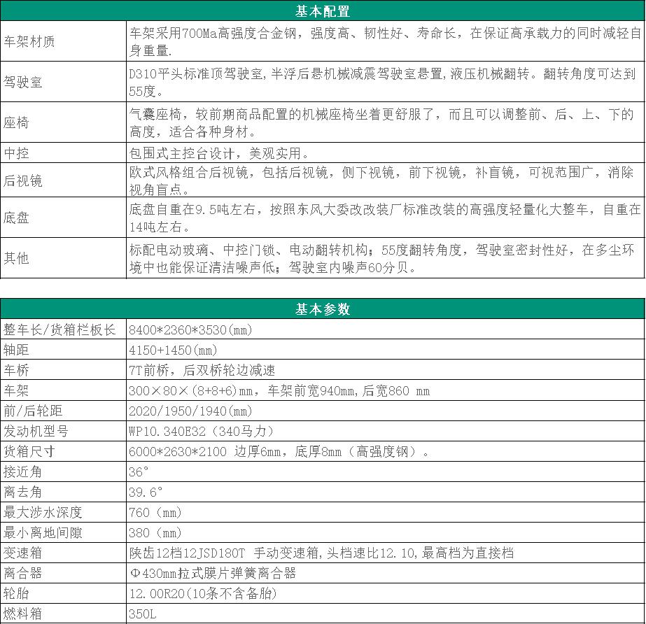 東風大力神KC六驅自卸車配置參數(shù):DFL3251KC型六驅大力神自卸車,采用天龍大力神KC駕駛室,三段式保險杠,液壓翻轉,帶原廠空調,濰柴國三WP12.340型340馬力發(fā)動機,法士特十二檔變速箱,軸距4500+1400mm,株齒分動箱,北奔9噸前驅動橋,選裝13/16噸輪減中后橋,輪減、差速鎖,大梁300mm自卸專用梁,輪胎12.00R20鋼絲胎10+1條,5.6米-6米自卸貨箱,車廂采用邊10底12mm鋼板,加裝淋水器。
