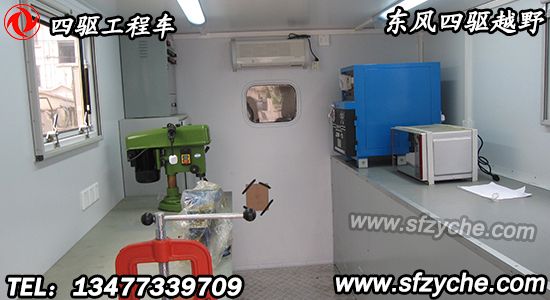 廂體頂部封閉,不可開啟?膳溲b功率相當、其他型號的發(fā)電機組。駕駛室前方安裝電動絞盤、廂體前部安裝備胎和可升降照明裝置、廂體內(nèi)部安裝有發(fā)電機組、電焊機、線纜盤、臺虎鉗、切割機、工作臺等維修工具。側防護、后防護與車輛均采用焊接連接,材料均為:Q235,后防護斷面尺寸(mm):100×60, 離地高度:500 mm.