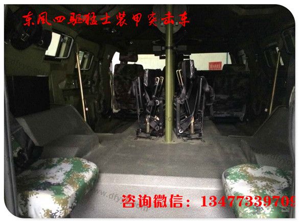 猛士裝甲內(nèi)飾:同樣受保密制度限制,沒有第一時(shí)間得到猛士裝甲版內(nèi)飾照片,與猛士基礎(chǔ)車型相仿,因?yàn)橹兄靡,車?nèi)中央通道前部被發(fā)動(dòng)機(jī)所占據(jù),后排座的中央通道形成一個(gè)平臺(tái),可放置貨品或?yàn)檐図斘淦骰咎峁┤藛T操作平臺(tái)。請(qǐng)注意上下兩幅圖的猛士裝甲版車門內(nèi)側(cè)特寫的不同。