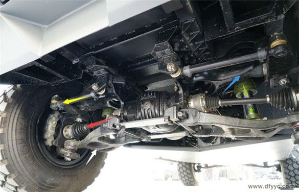 紅色箭頭為車內(nèi)的轉(zhuǎn)向管柱經(jīng)3段萬向節(jié)傳遞至齒條式轉(zhuǎn)向機(jī),并通過傳動(dòng)比放大螺桿至驅(qū)動(dòng)輪的力矩傳遞特寫。幾乎所有反恐車以及越野車都采用的是搖臂式轉(zhuǎn)向機(jī),這種結(jié)構(gòu)有助于降低越野工況下轉(zhuǎn)向驅(qū)動(dòng)輪對(duì)轉(zhuǎn)向機(jī)反向作用力,但是對(duì)路感的反饋較低。而齒條式轉(zhuǎn)向機(jī)多用于乘用車以及高性能跑車。齒條結(jié)構(gòu)可以輸出更精準(zhǔn)的轉(zhuǎn)向力,但對(duì)轉(zhuǎn)向輪逆向反饋的作用力承受力較低。而東風(fēng)四驅(qū)裝甲防雷反恐戰(zhàn)車采用齒條式轉(zhuǎn)向機(jī),為了降低轉(zhuǎn)向驅(qū)動(dòng)輪逆向反饋給轉(zhuǎn)向機(jī)較大的回饋力,通過增加一組轉(zhuǎn)向扭矩放大組件來解決,同時(shí)為整車提供更精準(zhǔn)的轉(zhuǎn)向系統(tǒng)。這種技術(shù)的提升是東風(fēng)商用車在特種裝備領(lǐng)域研發(fā)中的重大嘗試。